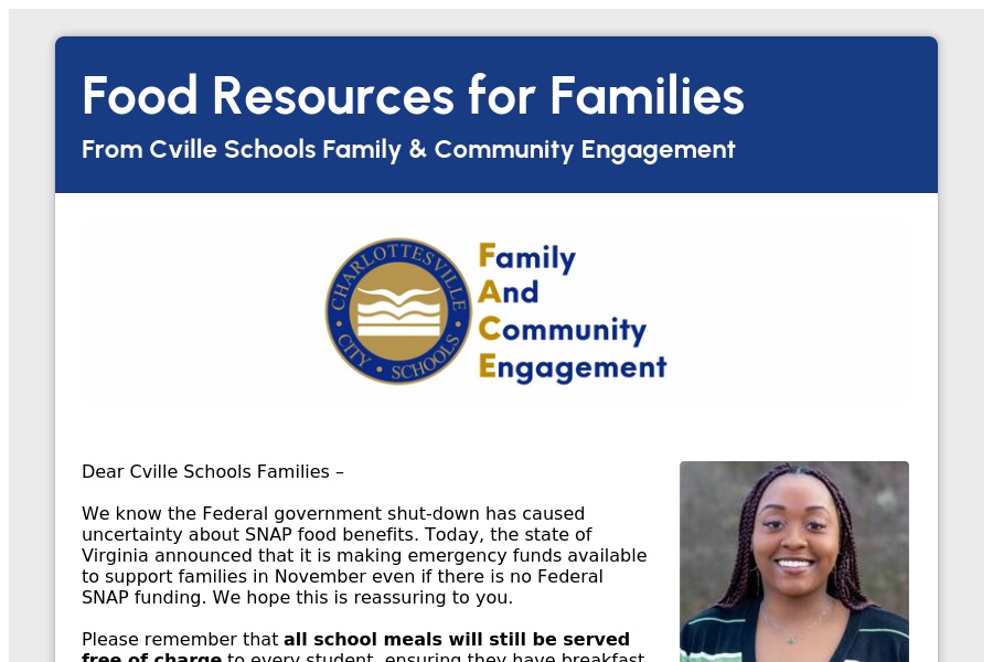 Food Resources for Families From Cville Schools Family & Community Engagement Dear Cville Schools Families We know the Federal government shut-down . . .